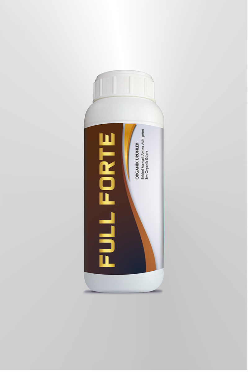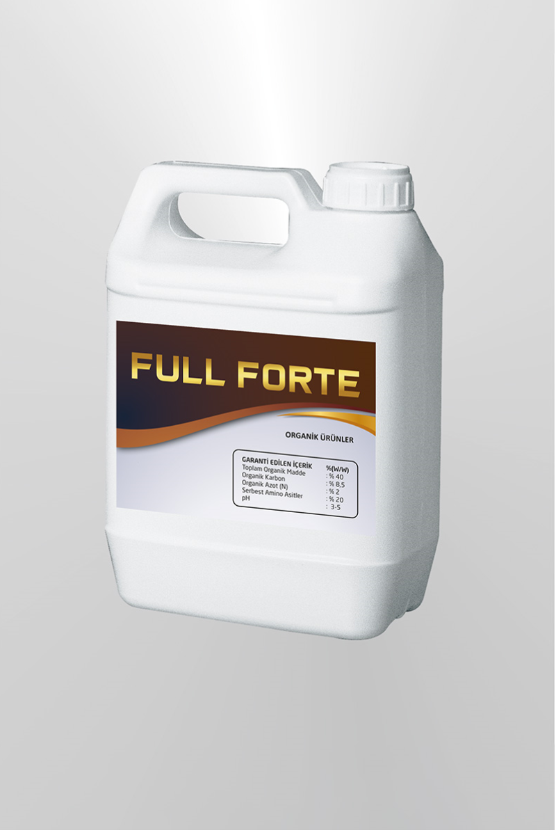 FULL FORTE liquid organic fertilizer contains 30% total organic product, 14% organic carbon, 1.5% total nitrogen and 2% free amino acids; designed for foliar, drip and soil applications to comprehensively support plant growth and productivity