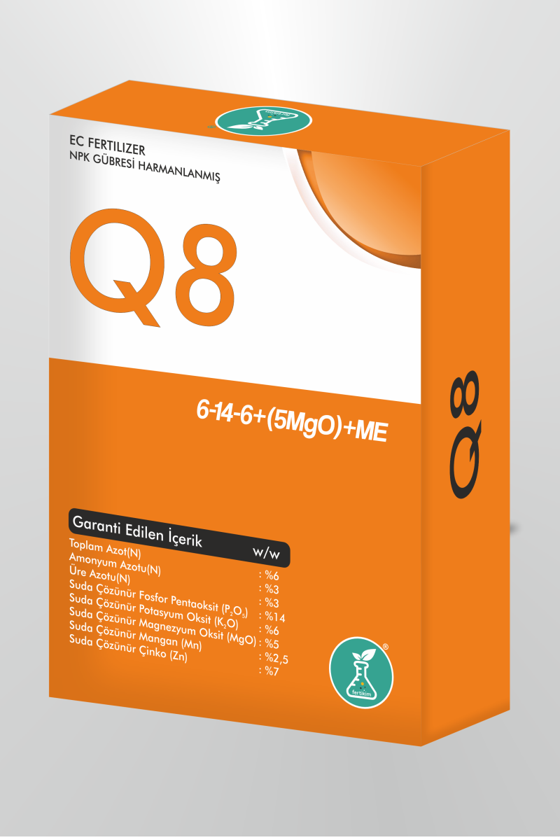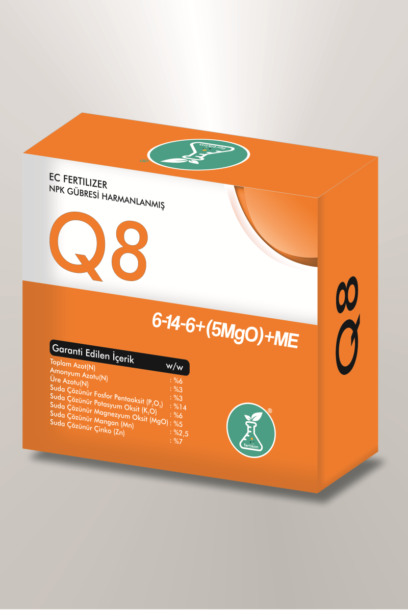 The Q8 6-14-6+(5MgO)+ME fertilizer contains 6% total nitrogen, 14% water-soluble phosphorus pentoxide, 6% water-soluble potassium oxide and 5% water-soluble magnesium oxide; enriched with 2.5% Manganese and 7% Zinc and designed for foliar, drip-irrigation and soil applications in professional agriculture.